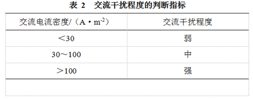 穩(wěn)態(tài)的交流干擾可能導(dǎo)致管道發(fā)生交流腐蝕。目前,對(duì)于交流腐蝕的評(píng)價(jià)指標(biāo)國(guó)際上尚未統(tǒng)一。GB/T 50698―2011《埋地鋼質(zhì)管道交流干擾防護(hù)技術(shù)標(biāo)準(zhǔn)》吸取了歐洲標(biāo)準(zhǔn)規(guī)定:當(dāng)管道上的交流干擾電壓不高于4 V時(shí),可不采取交流干擾防護(hù)措施;高于4 V時(shí),應(yīng)采用交流電流密度進(jìn)行評(píng)估。當(dāng)交流電流密度在30 A/m2以下時(shí),交流腐蝕風(fēng)險(xiǎn)較弱(表 2)。
