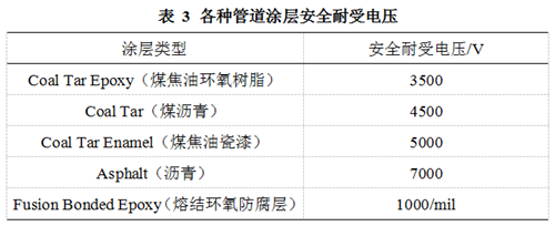 暫態(tài)交流干擾下管道上會(huì)產(chǎn)生很高的交流電壓,嚴(yán)重時(shí)會(huì)擊穿管道涂層。Dabkowski[7]給出了各種不同涂層的安全耐受電壓(表 3)。