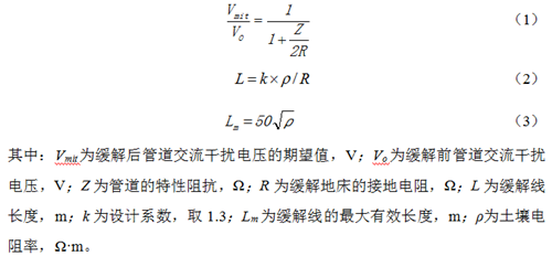 傳統(tǒng)的經(jīng)驗(yàn)公式設(shè)計(jì)主要針對(duì)單點(diǎn)排流,采用幅值處緩解方針,根據(jù)現(xiàn)場(chǎng)調(diào)研和檢測(cè)結(jié)果,初步確定緩解方式和地床大小,再根據(jù)現(xiàn)場(chǎng)模擬緩解試驗(yàn)確定緩解點(diǎn)和緩解量。對(duì)于不具備現(xiàn)場(chǎng)試驗(yàn)的地段,可以根據(jù)經(jīng)驗(yàn)公式(1)和(2)計(jì)算緩解量和緩解線長(zhǎng)度。對(duì)于穩(wěn)態(tài)交流干擾而言,緩解效果主要依賴于緩解地床的接地電阻[8]。由于緩解的本質(zhì)基于平均管地電位差,所以一味地增加緩解線長(zhǎng)度以期降低接地電阻從而達(dá)到更好的緩解效果是不現(xiàn)實(shí)的。有學(xué)者提出存在緩解線長(zhǎng)度極值,當(dāng)緩解線長(zhǎng)度大于該值時(shí),增加緩解線長(zhǎng)度并不能再有效地降低管道交流干擾電壓,該長(zhǎng)度極值可根據(jù)公式(3)大致確定[9]。傳統(tǒng)方法操作簡(jiǎn)單,適用于干擾程度和范圍較小的情況,是一種單點(diǎn)設(shè)計(jì)法,無法對(duì)管道全線進(jìn)行綜合考慮,存在一定的局限性。