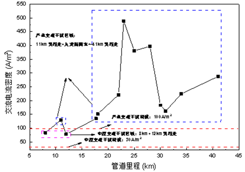 圖 1 管道沿線交流干擾電壓和交流電流密度分布