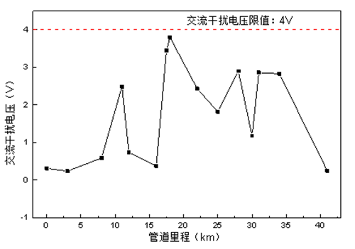 圖 3 緩解后管道沿線交流干擾分布