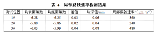 使用ER腐蝕探頭對(duì)強(qiáng)交流干擾下管道腐蝕速率進(jìn)行了實(shí)時(shí)監(jiān)測(cè),監(jiān)測(cè)時(shí)間為2個(gè)月,將ER腐蝕探頭取出后,發(fā)現(xiàn)探頭存在較為嚴(yán)重的局部腐蝕現(xiàn)象(圖 2)。采用DDC-II型點(diǎn)腐蝕探測(cè)儀對(duì)探頭表面3個(gè)位置處的局部腐蝕速率進(jìn)行檢測(cè),結(jié)果見表 4,遠(yuǎn)超ASTM標(biāo)準(zhǔn)中規(guī)定的10 μm/a限值。管道交流腐蝕風(fēng)險(xiǎn)較高,亟需對(duì)其進(jìn)行緩解。此外,通過ER探頭測(cè)試結(jié)果可知試片的平均腐蝕速率為360 μm/a,這相當(dāng)于0.31 A/m2的直流電流的腐蝕量。而此處的交流電流密度為488.07 A/m2,表明約0.06%的交流電流密度產(chǎn)生了腐蝕。