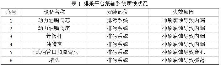 長寧頁巖氣開采過程主要分為排采和生產(chǎn)兩個階段。排采階段頁巖氣井產(chǎn)氣量高、產(chǎn)水量大、出砂較多,單井產(chǎn)氣量可達(dá)20 ~40萬m3/d,產(chǎn)水量可達(dá)100 ~200 m3/d,平臺處理氣量可達(dá)100萬m3/d左右。排采階段井口溫度約為60~70℃,流程溫度約為40~50℃,平臺集輸系統(tǒng)壓力約為20 ~30 MPa。生產(chǎn)階段頁巖氣井產(chǎn)氣量、產(chǎn)水量、出砂量較排采階段大幅下降,單井產(chǎn)氣量約為10萬m3/d以內(nèi),產(chǎn)水量約為30 m3/d以內(nèi),平臺處理氣量約在60萬m3/d以內(nèi)。生產(chǎn)階段井口溫度約為40~50℃,流程溫度約為30~40℃,平臺集輸系統(tǒng)壓力約為5~8 MPa。排采期,長寧頁巖氣單井出砂量最高達(dá)到了10 t/d,集輸系統(tǒng)部件沖刷腐蝕失效問題明顯,如表1、圖1所示。