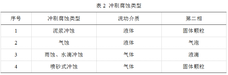 沖刷腐蝕(Erosion-Corrosion)[1]是金屬表面與腐蝕流體之間由于高速相對運(yùn)動而引起的金屬損壞現(xiàn)象,是材料受沖刷和腐蝕協(xié)同作用的結(jié)果。根據(jù)介質(zhì)可將沖蝕磨損分為兩大類:氣液噴砂型沖蝕及液流或水滴型沖蝕[2]。流動介質(zhì)中攜帶的第二相可以是固體粒子、液滴或氣泡,它們有的直接沖擊材料表面,有的則在表面上潰滅(氣泡),從而對材料表面施加機(jī)械力。如果按流動介質(zhì)及第二相排列組合,則可把沖蝕磨損分為四種類型[3],如表2所示。