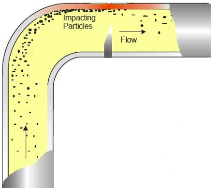 砂含量是沖刷腐蝕的主控因素之一。砂礫在管道內(nèi)隨氣液介質(zhì)流動,遇到彎頭時流動狀態(tài)發(fā)生劇烈變化。砂礫沖擊管壁后因慣性作用將沿管壁繼續(xù)向前流動,如圖2所示。