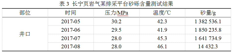 使用“非侵入式砂含量測試技術(shù)”測得長寧頁巖氣某排采平臺集輸系統(tǒng)砂含量變化,如表3所示。
