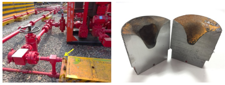 長寧頁巖氣主要表現(xiàn)為噴砂式?jīng)_蝕,即高流速高砂量介質(zhì)直接沖擊集輸系統(tǒng)管壁,導(dǎo)致其短時間內(nèi)減薄穿孔。