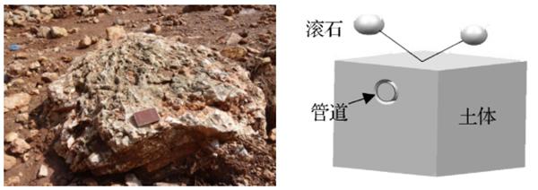 (a.現(xiàn)場照片; b.漂礫撞擊覆土示意圖)