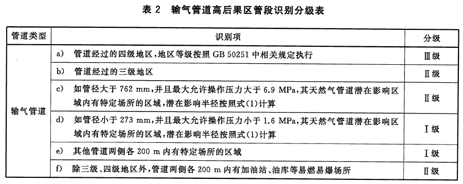 (3)6.1.2.1輸氣管道高后果區(qū)識(shí)別準(zhǔn)則第一條第二條規(guī)定:管道經(jīng)過的四級(jí)地區(qū)、三級(jí)地區(qū)為高后果區(qū),但是沒有明確距離管道中心線距離范圍。那么這個(gè)距離范圍可以理解為管徑大于762 mm,并且最大允許操作壓力大于6.9 MPa的管道潛在半徑;管徑小于273 mm,并且最大允許操作壓力小于1.6 MPa的管道潛在半徑。