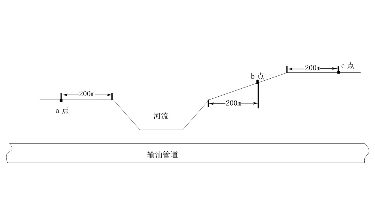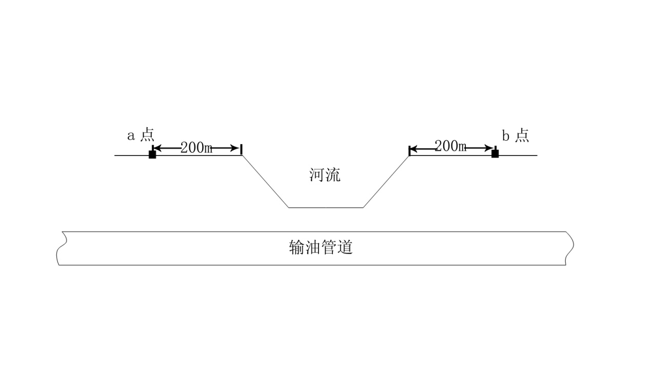 圖2是管道兩側(cè)地勢(shì)高差一側(cè)低,一側(cè)高的情況,高后果區(qū)邊界正常設(shè)定在b、c兩點(diǎn),其中b點(diǎn)滿足在管道泄漏后,油流可以克服阻力逆向流入河流中的最遠(yuǎn)距離,由于確認(rèn)b點(diǎn)需要考慮較多因素,確認(rèn)難度較大,出于安全范圍考慮,建議選擇a點(diǎn)、b點(diǎn)。