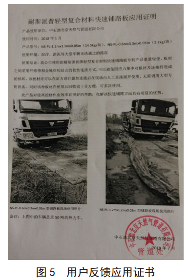 北京華油慧通管道技術(shù)服務(wù)有限公司和天津耐斯工程技術(shù)有限公司自2016年起歷時兩年開展輕型復合材料快速鋪路板研發(fā),經(jīng)過多次現(xiàn)場模擬試驗,產(chǎn)品最終達到檢驗標準要求,通過了國家化學建筑材料測試中心在不同野外環(huán)境下的碾壓測試,主要包括泥地、水泥路、碎石路、土路及泥沼地帶等路況下的性能檢測。值得一提的是,該產(chǎn)品使用后經(jīng)過簡單修復還能繼續(xù)正常使用并同時通過了測試(圖 1)。該產(chǎn)品已獲頒國家實用新型專利證書(圖 2)。