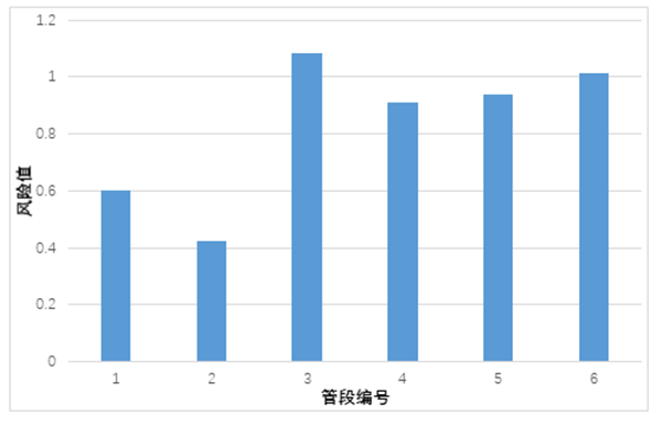 對(duì)某輸油管道的一個(gè)站間進(jìn)行實(shí)際應(yīng)用。管道長(zhǎng)90 km,輸送汽油,管徑610 mm,設(shè)計(jì)壓力8 MPa,運(yùn)行壓力5 MPa。收集分析所需要的數(shù)據(jù),將管道最終劃分為6個(gè)管段。隨后對(duì)每個(gè)管段進(jìn)行了風(fēng)險(xiǎn)計(jì)算,結(jié)果見圖 3。