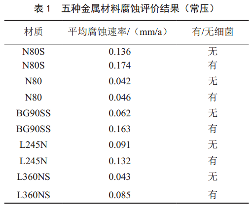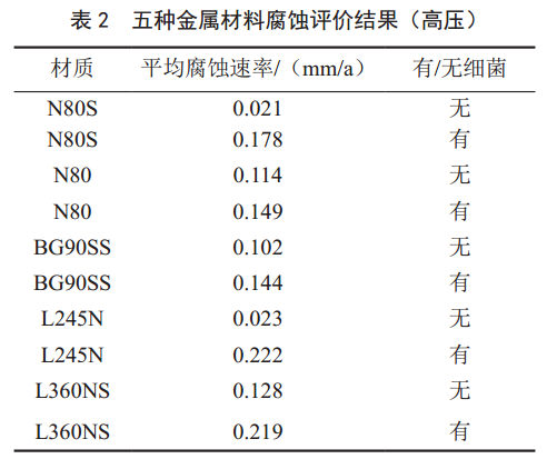 實驗研究了N80S、 N80、 BG90SS、 L245N、L360NS五種金屬材料在頁巖氣返排液無菌/有菌環(huán)境中及常壓/高壓條件下的腐蝕狀況,結果得出以下結論。