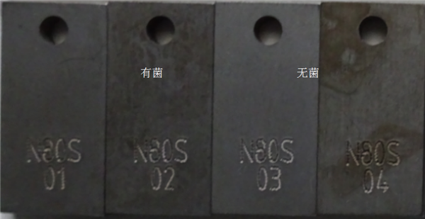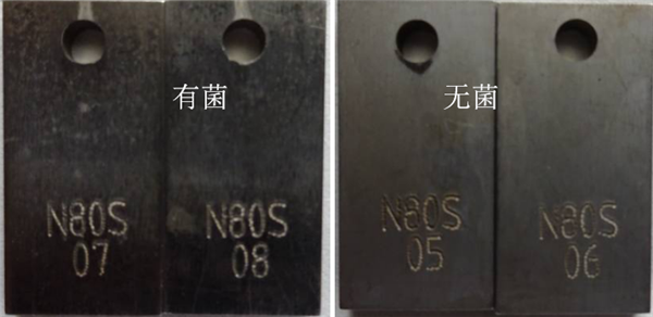 根據(jù)NACE RP0775―2005,從表 2可以看出:①N80S在無菌環(huán)境中腐蝕速率為0.021 mm/a,有菌環(huán)境中的腐蝕速率是無細菌環(huán)境中的8.48倍,分別屬于輕度腐蝕和嚴重腐蝕。②N80在無菌環(huán)境中腐蝕速率為0.114 mm/a,有菌環(huán)境中的腐蝕速率是無細菌環(huán)境中的1.31倍,分別屬于中度腐蝕和嚴重腐蝕。③BG90SS在無菌環(huán)境中腐蝕速率為0.102 mm/a,有菌環(huán)境中的腐蝕速率是無細菌環(huán)境中的1.41倍,分別屬于中度腐蝕和嚴重腐蝕。④L245N在無菌環(huán)境中腐蝕速率為0.023 mm/a,有菌環(huán)境中的腐蝕速率是無細菌環(huán)境中的9.65倍,分別屬于中度腐蝕和嚴重腐蝕。⑤L360NS在無菌環(huán)境中腐蝕速率為0.128 mm/a,有菌環(huán)境中的腐蝕速率是無細菌環(huán)境中的1.71倍。均屬于嚴重腐蝕。試片表面為均勻腐蝕,部分存在點蝕,如圖 3所示。