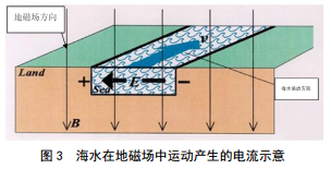 隨著海水的潮漲潮落,在地磁場(chǎng)作用下海峽地帶或海灣處會(huì)產(chǎn)生電場(chǎng)(圖 3),電場(chǎng)在大地中產(chǎn)生地電位梯度,進(jìn)而干擾管道電位。高潮時(shí),管道側(cè)的地電位梯度大于海岸線側(cè),管道電位正向偏移,低潮時(shí) 則相反;地電位梯度隨著高潮時(shí)間不斷累積,也隨之增大,低潮時(shí)則相反;所以受干擾管道電位是隨著時(shí)間緩慢變化的(逐漸正向或負(fù)向偏移)。
