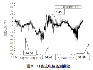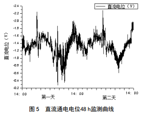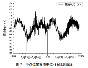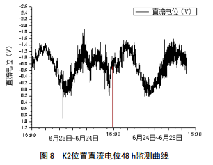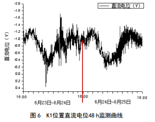 可以看出,管道電位變化的極值與潮汐產(chǎn)生的高潮和低潮時(shí)間點(diǎn)有極大相關(guān)性,均是在高潮時(shí)管道電位正向偏移,低潮時(shí)管道電位負(fù)向偏移。因此推斷直流電位波動(dòng)受潮汐能干擾所致。