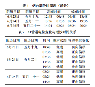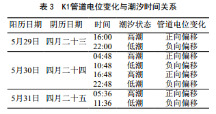 由圖 6~8可知,該段管道在48 h內(nèi)電位波動(dòng)方向和強(qiáng)弱基本一致,可以看出該管段電位異常波動(dòng)為同一干擾源所致。該管段直流電位每天都有2次正向偏移和2次負(fù)向偏移(相較于自然電位﹣0.7 VCSE),在凌晨1:30電位達(dá)到最正,經(jīng)查詢煙臺(tái)潮汐時(shí)間表(表 1,來源于天氣網(wǎng)),對(duì)照監(jiān)測(cè)管道電位波動(dòng)日期及時(shí)間, K1位置管道電位變化與潮汐時(shí)間關(guān)系如 表 2所示。