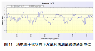 日常測(cè)試管道斷電電位時(shí),可以斷開陰極保護(hù)電流,但無法斷開地電流產(chǎn)生的電壓降V t,這會(huì)產(chǎn)生很大的電位測(cè)試誤差(圖 10),因此采用垂直管道放置2個(gè)試片的方法測(cè)試管道通斷電位曲線(圖 11)。