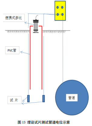 由于大地中存在的地電位梯度無法消除,傳統(tǒng)的管道通電電位、斷電電位測(cè)試已經(jīng)無法準(zhǔn)確評(píng)估管道真實(shí)的陰極保護(hù)狀況。為了消除地電流影響,可以埋設(shè)參比管以及雙試片或環(huán)形試片來準(zhǔn)確測(cè)試管道陰極保護(hù)狀況,如圖 13所示。