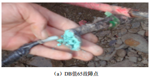 通過開挖陰極保護(hù)陽極電纜故障點(diǎn),發(fā)現(xiàn)陽極電纜出現(xiàn)鼓包,漏出藍(lán)色銅銹。分析原因可能是陰保站建站時(shí)期或陽極電纜附近存在交叉施工,造成電纜護(hù)套破損,電纜銅芯直接和大地接觸,電流從防腐層破損點(diǎn)處流出,加速了故障點(diǎn)的腐蝕,并最終導(dǎo)致電纜完全斷開,造成陰保系統(tǒng)回路電阻突然變大,設(shè)備運(yùn)行異常。