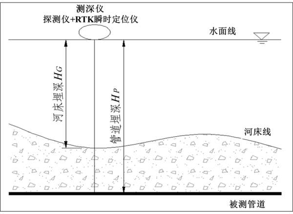 電磁測(cè)深技術(shù)采用的設(shè)備包括探管儀、測(cè)深儀及RTK瞬時(shí)定位儀。通過探管儀發(fā)射機(jī)對(duì)被測(cè)管線施加信號(hào),在被測(cè)管線周圍產(chǎn)生二級(jí)磁場(chǎng),然后通過接收機(jī)在地面接收管線的二次磁場(chǎng),從而準(zhǔn)確地確定管線的位置、埋深、走向、路徑。如圖 1所示,先利用探管儀在水面上確定管道的中心位置,探測(cè)管道埋深H P;在確定位置的同時(shí)采用RTK瞬時(shí)定位儀對(duì)管道進(jìn)行瞬時(shí)定位,并用測(cè)深儀(測(cè)深儀與RTK瞬時(shí)定位儀連接在一起)測(cè)出此點(diǎn)的瞬時(shí)水深HG,然后按照式1計(jì)算管道中心距河床的深度即管道埋深H 。在測(cè)試的過程中,沿管道軸線按每2 m采一個(gè)測(cè)點(diǎn),如果遇到埋深波動(dòng)超過15 cm的地段應(yīng)加密進(jìn)行探測(cè)。