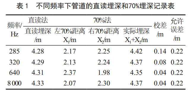 從表 1可以看出,直讀法與70%法計(jì)算所得管道埋深較為接近,最大校差為0.14 m,小于允許誤差(0.22 m, 70%法測(cè)得各頻率下平均值4.38的5%)。表明,實(shí)際測(cè)試時(shí)可以用直讀法代替70%法取得管道埋深數(shù)據(jù)。此外, 8 kHz頻率下直讀的4.33 m最接近70%法的平均值4.38 m,誤差最小,所以該段管道埋深測(cè)試采用的頻率應(yīng)為8 kHz。