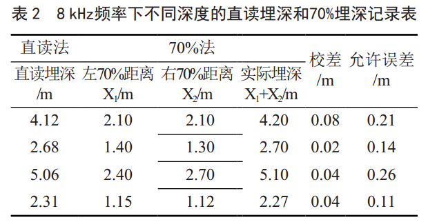 以上只是對(duì)一個(gè)固定埋深(4.38 m)進(jìn)行對(duì)比,結(jié)果誤差較小,為了驗(yàn)證不同深度下均可用直讀數(shù)據(jù)代替70%法測(cè)得的實(shí)際埋深,又選取了幾個(gè)不同埋深的管段進(jìn)行了實(shí)驗(yàn),實(shí)驗(yàn)結(jié)果如表 2所示。