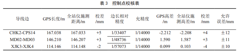 對(duì)搜集的控制點(diǎn)進(jìn)行校核,要求平面控制達(dá)到一級(jí)導(dǎo)線精度,高程控制達(dá)到四等光電測(cè)距三角高程精度。滿足二者要求后控制點(diǎn)可以利用。