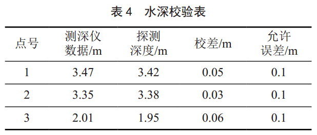 測(cè)深儀與RTK瞬時(shí)定位儀連接好后,應(yīng)對(duì)測(cè)試水深作校驗(yàn)。校驗(yàn)方法如下,先用儀器測(cè)量水深,再在同一位置用標(biāo)桿測(cè)量,二者比較,小于0.1 m時(shí)候測(cè)深儀誤差在合理范圍內(nèi)。測(cè)試點(diǎn)選擇了3個(gè)水深校驗(yàn)點(diǎn),校差為0.03~0.06 m,詳見水深校驗(yàn)表 4。