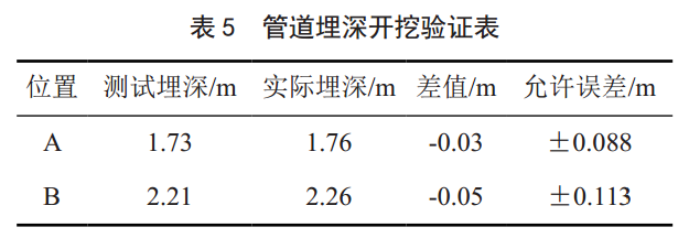 在被測(cè)管道陸地部分選擇一處測(cè)試點(diǎn)進(jìn)行測(cè)試,并采用直接開挖的方法對(duì)管道埋深進(jìn)行驗(yàn)證。其目的是獲取儀器測(cè)試值與實(shí)際埋深值之間的差異,掌握儀器誤差,測(cè)試結(jié)果如表 5所示。