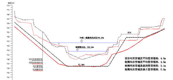 當(dāng)數(shù)據(jù)采集完成之后,將每一個(gè)點(diǎn)對(duì)應(yīng)的坐標(biāo)、水面高程、水深、水底高程、管道埋深等數(shù)據(jù)進(jìn)行一一對(duì)應(yīng),并繪出穿越斷面的平面帶狀圖、河床斷面圖及管道埋深斷面圖。在斷面圖上,清楚反映已經(jīng)敷設(shè)管道的埋深,可供管理者使用。