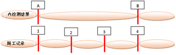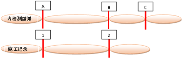 數(shù)據(jù)對(duì)齊是將建管數(shù)據(jù)與內(nèi)檢測(cè)數(shù)據(jù)進(jìn)行一一對(duì)應(yīng)[1],以數(shù)據(jù)中相同且固定的特征標(biāo)識(shí)(閥門、三通、彎頭)為起始點(diǎn),比對(duì)每一根管節(jié)長(zhǎng)度,通過(guò)管長(zhǎng)最小差實(shí)現(xiàn)二者數(shù)據(jù)的對(duì)齊。對(duì)施工記錄、檢測(cè)記錄、監(jiān)理記錄、底片中的焊口信息(如:焊口編號(hào)、施工日期、檢測(cè)日期、監(jiān)理旁站日期等)進(jìn)行一致性和邏輯關(guān)系復(fù)核。數(shù)據(jù)對(duì)齊對(duì)于疑似黑口的準(zhǔn)確定位至關(guān)重要,一旦出錯(cuò),后續(xù)工作均會(huì)受到影響。在數(shù)據(jù)對(duì)齊表中需要記錄管線名稱、標(biāo)段、壁厚、樁號(hào)里程、管號(hào)、焊口編號(hào)、施工管長(zhǎng)、施工日期,以及內(nèi)檢測(cè)的焊縫編號(hào)、管長(zhǎng)、檢測(cè)里程、設(shè)備和缺陷等信息,從中可以直觀查看施工記錄和內(nèi)檢測(cè)的對(duì)應(yīng)關(guān)系(圖 5)。
