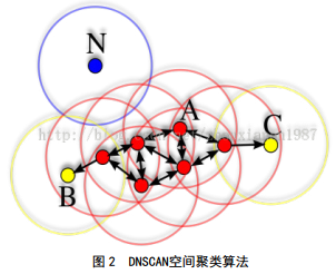 常用的聚類算法有k-means算法,試用后發(fā)現(xiàn)k-means算法基于平均距離決定同類聚集,適用于球形聚集,不適合民房空間分布。通過比較研究,選擇了具有噪聲的基于密度的DBSCAN(Density-BasedSpatial Clustering of Applications with Noise)聚類算法,該算法是以密度、而不是距離來計算簇和簇邊界。其基本思路(圖 2)是以建筑密集區(qū)域的某一建筑為圓心,選擇合適半徑畫圓,即規(guī)定了圓的半徑及圓內(nèi)最少包含的建筑密度。若圓內(nèi)建筑密度大于等于預(yù)先指定的值,那么這個圓圈的圓心就轉(zhuǎn)移至該圓圈內(nèi)的其他建筑,繼續(xù)畫圓去計算,直至圓內(nèi)所包含的建筑密度少于預(yù)先指定的值,聚類終止;诿芏鹊腄BSCAN聚類算法適用于在管線周圍建筑分布區(qū)域中,去尋找高密度分布的區(qū)域,并與建筑分布形狀無關(guān)。