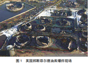 2005年12月,英國(guó)邦斯菲爾德油庫(kù)爆炸是迄今為止歐洲最大的一次火災(zāi)爆炸事故,燒毀大型油罐20余座,傷43人,直接經(jīng)濟(jì)損失2.5億英鎊,事故的直接原因是一臺(tái)儲(chǔ)罐的液位測(cè)量系統(tǒng)失效,液位達(dá)到限定高度后未能關(guān)閉進(jìn)油閥,從而導(dǎo)致汽油從罐頂溢出,油氣遇明火而爆炸(圖 1)。