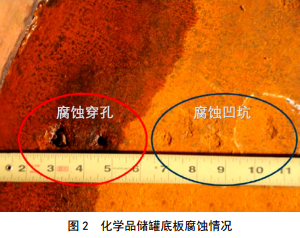 2014年1月,位于西弗吉尼亞州的美國(guó)自由工業(yè)公司發(fā)生了一起嚴(yán)重的化學(xué)品泄漏事故,大量的甲基環(huán)己烷-甲醇原料和聚乙二醇醚的混合物滲流進(jìn)儲(chǔ)罐周圍的碎石和土壤中,通過(guò)防火堤的裂隙和鄰近儲(chǔ)罐底部的地下涵洞進(jìn)入河流和公共水處理站入口,導(dǎo)致集輸系統(tǒng)中的飲用水被污染,當(dāng)?shù)?0萬(wàn)居民受到影響,大范圍的商業(yè)、學(xué)校、公共部門停業(yè),醫(yī)院擠滿了因中毒而就診的病人。事故的主要原因是未及時(shí)實(shí)施檢驗(yàn),導(dǎo)致底板腐蝕穿孔而未能發(fā)現(xiàn)(圖 2)。
