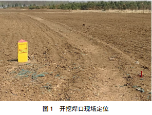 根據(jù)焊口清單、《環(huán)焊縫焊口定位作業(yè)管理規(guī)定》和焊口基礎信息,對需要開挖復拍的焊口定位。定位過程中同時收集焊口周邊地形地貌、地質(zhì)條件等信息,并根據(jù)現(xiàn)場情況,評估開挖難度,測算土方工程量及措施工程量,為后續(xù)開挖作業(yè)提供指導,現(xiàn)場定位情況如圖 1所示,紅色標志為定位點。在批次焊口定位完成后,定位單位形成簽字蓋章版定位報告, 報告包含每道焊口的位置信息、埋深、周邊地貌及地質(zhì)條件、土質(zhì)類型、工程量、措施量等信息,為項目預算和焊口開挖提供前期基礎數(shù)據(jù)[2]。