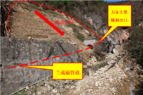 某線性工程選線時(shí)只注重局部地質(zhì)條件的分析而忽略了對(duì)區(qū)域地質(zhì)背景的把握,線路沿大的斷裂破碎帶敷設(shè),致使線路建成后災(zāi)害不斷,給其安全運(yùn)營(yíng)造成嚴(yán)重的威脅和巨大的經(jīng)濟(jì)損失。再如蘭成渝管道萬(wàn)家大梁隧道出口位置選擇不當(dāng),導(dǎo)致滑坡對(duì)運(yùn)營(yíng)管道產(chǎn)生嚴(yán)重危害(圖 4)。