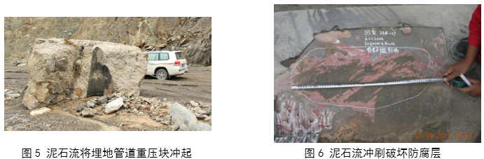 新疆庫(kù)米什山谷地區(qū),沿山谷敷設(shè)的管道和壓重塊都被泥石流巨大的推浮力推浮到地表,造成防腐層破壞及形成管道表面缺陷(圖 5、圖 6)。