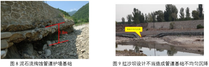 當(dāng)管道和泥石流“伴行”時(shí),要考慮泥石流的側(cè)向侵蝕,因?yàn)槟嗍餮貜澢鷾系肋\(yùn)動(dòng)時(shí)速度快、慣性大,在彎道凹岸處有顯著的彎道超高現(xiàn)象。行進(jìn)中的泥石流若突然受陡壁阻擋,會(huì)在凹岸底部產(chǎn) 生強(qiáng)大的環(huán)流,對(duì)凹岸產(chǎn)生極大的破壞力(圖 8),攔沙壩設(shè)計(jì)不當(dāng)造成管道基礎(chǔ)不均勻沉降(圖 9),所以,泥石流排導(dǎo)溝槽要增加防掏蝕和沖擊的措施。