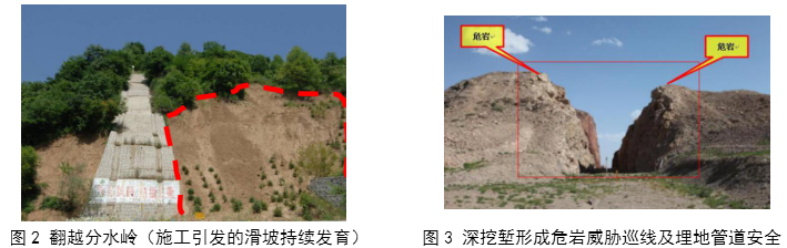 正確的選定線是管道減災(zāi)防災(zāi)工作的基礎(chǔ),既決定了管道的建設(shè)和運(yùn)營(yíng)成本,也決定了未來(lái)管道減災(zāi)防災(zāi)工作量。復(fù)雜地質(zhì)條件下,越嶺選線和河谷選線十分關(guān)鍵,其好壞基本決定了線路的優(yōu)劣,是整個(gè)線路的關(guān)鍵控制性工程。越嶺位置要盡量避開(kāi)地質(zhì)災(zāi)害或地質(zhì)災(zāi)害隱患點(diǎn),大型山嶺的穿越要綜合考慮宏觀地質(zhì)構(gòu)造和局部地質(zhì)條件,在盡量繞避或者大角度穿越高地震斷裂帶、地形激變帶時(shí),盡量避開(kāi)大型滑坡和滑坡連續(xù)分布地段,巖層順傾地段和厚層堆積層地段,避免施工開(kāi)挖造成新的滑坡和危巖崩塌(圖 2、圖 3)。