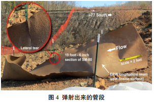 2012年12月11日12時(shí)41分 ,位于美國(guó)西弗吉尼亞州的哥倫比亞輸氣公司管徑508 mm的州際埋地天然氣管道(SM-80管線(xiàn))發(fā)生破裂燃燒(圖 1)。影響了沿管道長(zhǎng)335 m、寬約250 m的范圍,摧毀了附近的三座房屋和停放在破裂中心點(diǎn)附近的車(chē)輛,約245 m瀝青路面嚴(yán)重?zé)龤,州際公路關(guān)閉長(zhǎng)達(dá)19個(gè)小時(shí)。沒(méi)有造成人員死亡或嚴(yán)重傷害。泄漏天然氣2.15億m3,價(jià)值28.5萬(wàn)美元。管道修復(fù)花費(fèi)290萬(wàn)美元,對(duì)該管道的內(nèi)檢測(cè)適用性改造升級(jí)花費(fèi)550萬(wàn)美元。