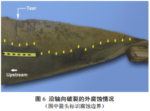 該涂層在管道表面的覆蓋不同。沿管道底部許多區(qū)域,沒(méi)有任何的保護(hù)涂層。沿側(cè)面區(qū)域管道覆蓋在綠色涂層下而不是煤焦油之下。沿管道頂部,綠色涂層大部分被煤焦油覆蓋。壁厚測(cè)量結(jié)果表明,上游管段平均壁厚為7.06 mm,下游管段平均壁厚為7.19 mm。清潔后縱向斷裂視覺(jué)檢查顯示存在明顯的外部腐蝕破壞區(qū)域?yàn)殚L(zhǎng)1.90 mm,寬0.74 m(圖 6)。斷裂表面的目視檢查確定該斷裂立即引起了上游的橫向撕裂。斷裂表面有粗糙和不規(guī)則的外觀,與韌性過(guò)載斷裂特征一致。