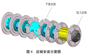 阻力皮碗既要保證有一定的強(qiáng)度和密封性,又要防止阻力太大造成推動(dòng)不均勻、不順暢,影響檢測(cè)器在管道中的勻速行進(jìn)。經(jīng)過(guò)大量試驗(yàn)反復(fù)修改皮碗幾何尺寸等參數(shù),最終優(yōu)化確定最合理的尺寸參數(shù),確保檢測(cè)器在管道中的通過(guò)性。皮碗安裝示意見(jiàn)圖 4。