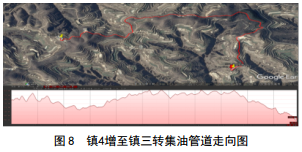 選擇采油十一廠鎮(zhèn)4增至鎮(zhèn)三轉(zhuǎn)集油管道800 m管段進(jìn)行檢測(cè)試驗(yàn),管道基本情況和高程見(jiàn)表 2和 圖 8。檢測(cè)結(jié)果在123.7 m處,壁厚信號(hào)振幅達(dá)486,疑似缺陷,見(jiàn)圖 9。