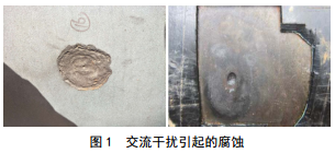 交流干擾危害有三種,一是潛在威脅操作人員的人身安全;二是強(qiáng)電干擾能沖擊沿途監(jiān)控閥室的電動(dòng)執(zhí)行機(jī)構(gòu)和工藝站場(chǎng)的電氣儀表自動(dòng)化設(shè)施,包括陰極保護(hù)站的恒電位儀;三是交流感應(yīng)電壓能引起交流腐蝕(圖 1),而且這種腐蝕是陰極保護(hù)所不能完全有效控制的,目前國(guó)內(nèi)外在交流腐蝕方面已經(jīng)頒布了不少研究報(bào)告或交流腐蝕控制標(biāo)準(zhǔn)。