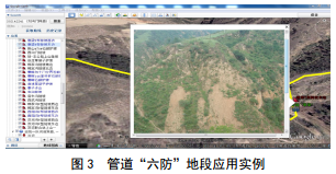 (1)“六防”區(qū)域管理。確定六防區(qū)域位置,收集典型照片,進行現(xiàn)狀描述。某管道滑坡段位于延安市志丹縣雙河鄉(xiāng)墩梁村,屬濕陷性黃土V字型陡坡地段,通過該系統(tǒng),可對管線所經(jīng)區(qū)域地形地貌、高度落差、周邊道路情況、泄漏流向、圍堵點選擇等進行鳥瞰瀏覽(圖 3)。