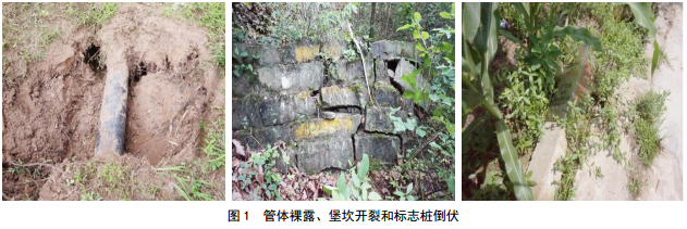 2015年10月,在普光氣田某輸氣管道宏觀檢查中,檢查水工保護設(shè)施928處,發(fā)現(xiàn)堡坎坍塌、開裂及水土流失導(dǎo)致管體裸露共63處;檢查“三樁一牌” 648個,倒伏、損壞10個(圖 1)。檢查情況及時反饋給相關(guān)管理部門,坍塌、開裂的堡坎已修復(fù),裸露管段已填埋,倒伏的“三樁一牌”已扶正加固,同時巡檢方加強了穿跨越段和易沖刷部位的巡檢頻率,并做好巡回檢查記錄。