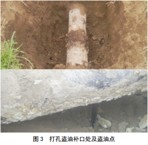 某采油廠原油外輸管道輸差波動較大,懷疑管道存在腐蝕穿孔或有不法分子打孔盜油,多次巡查現(xiàn)場沒發(fā)現(xiàn)問題。采用防腐層破損點查找技術(shù)沿管道敷設(shè)軌跡進行破損點查找,共發(fā)現(xiàn)27處破損點。對其全部開挖驗證:其中22處為歷年來發(fā)生打孔盜油的補口位置, 4處為外防腐層破損點, 1處為不法分子打孔盜油點(圖 3)。
