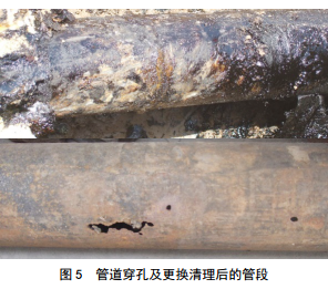 2016年6月,檢測油田本部某采油廠注水管道,在利用埋地管道防腐層檢測儀對防腐層進行檢測評估時,根據(jù)檢測異常數(shù)據(jù)開挖驗證,發(fā)現(xiàn)管道防腐層破損、管體腐蝕嚴重(圖 4)。根據(jù)檢測結(jié)果提出建議:更換管段10 m,防腐層大修。