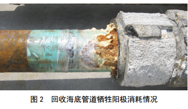 目前海底管道采用犧牲陽極陰極保護技術,但如果犧牲陽極存在設計缺陷、管道延壽都會導致陽極消耗后過早失去作用(圖 2),因此需要定期進行檢測或更換。而如何檢測海底管道的外防腐狀況是預防管道發(fā)生外部腐蝕或泄漏的關鍵。